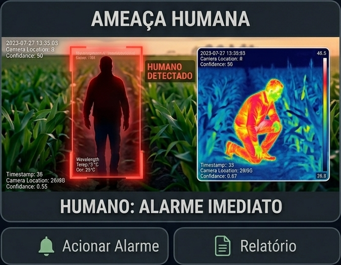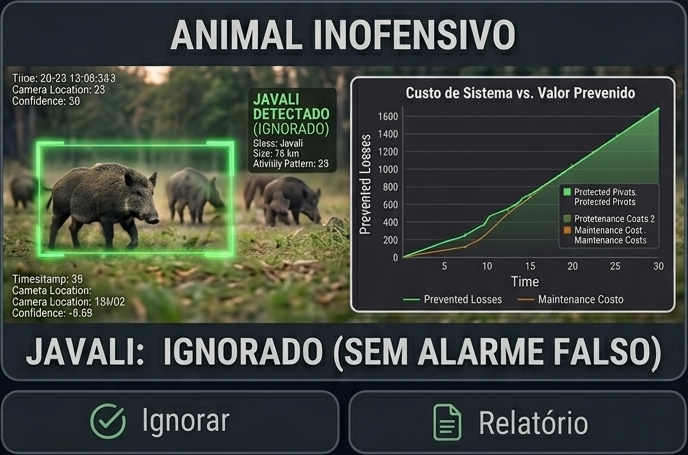 O fim dos falsos alarmes no campo. O sistema sabe exatamente a diferença entre a fauna local e invasores humanos.